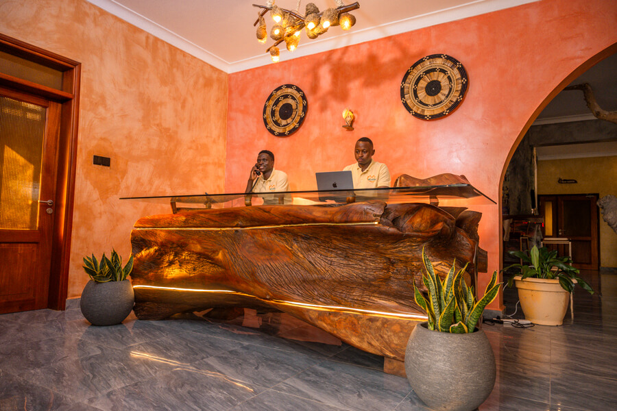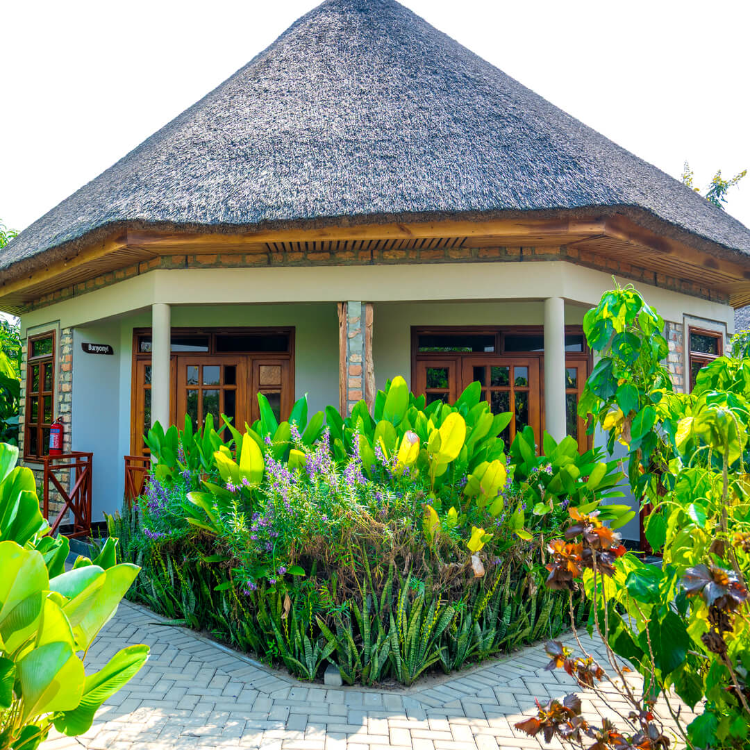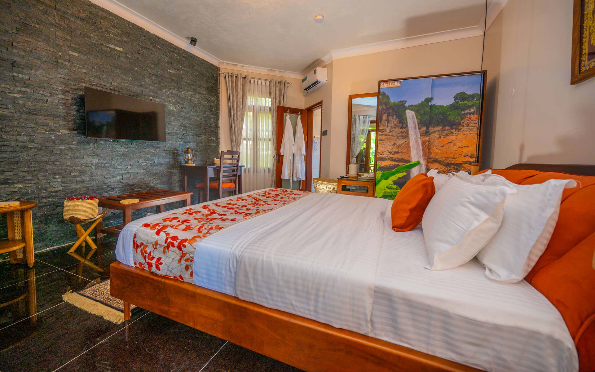 Epic Cottages is defined by its art, each piece handcrafted and inspired by the surrounding landscape. What began with fallen weaver bird nests transformed into light fittings and grew into a philosophy of creating beauty from natural and discarded materials. Textured wood, cow hide art, and reimagined patterns reflect sustainability and Ugandan heritage. Every room carries subtle artistic differences and is named after a Ugandan attraction, ensuring guests experience spaces that are distinctive, authentic, and deeply connected to culture and place.